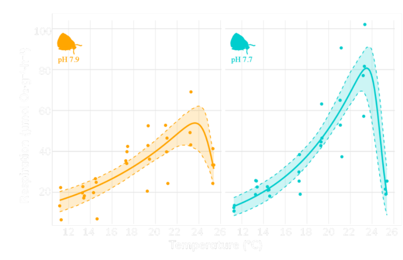 Therefore, this study asked: How does ocean acidification impact energetic expenditure across a range of ecologically relevant temperatures experienced by T. funebralis? To assess how ocean acidification and temperature interactively affect metabolic performance we conducted a mesocosm experiment to compare between two pH levels (ambient ~7.9; reduced ~7.7) across a gradient of eight ecologically relevant temperatures (12°C to 26°C, in 2°C increments). Respiration rates (O₂ consumption), a proxy for energetic expenditure through ATP production were measured after four weeks to generate thermal performance curves. Metabolic responses were then modeled using the Sharpe–Schoolfield equation, which incorporates enzyme kinetics to estimate key physiological parameters, including thermal optima and activation energy, under both ambient and acidified conditions. Results revealed a consistent pattern: sea snails exhibited significantly higher respiration rates near their thermal optimum (~22–24°C) under acidified conditions compared to ambient treatments, indicating that ocean acidification imposes additional metabolic costs even at temperatures typically associated with peak performance. This increase in oxygen demand likely reflects elevated energetic requirements for maintaining acid–base regulation and biomineralization under acidified seawater, where reduced carbonate ion availability (CO₃²⁻) constrains the chemical conditions necessary for shell formation. Together, these findings demonstrate that ocean acidification reshapes thermal performance by elevating metabolic demand, thereby constraining energy budgets and increasing the costs of maintaining essential physiological processes in a rapidly warming ocean.